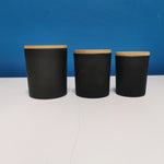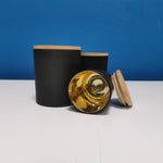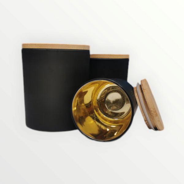 Black candle glasses with gold inner and wooden lid.