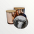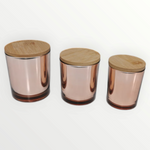 Metallic Rose Gold candle glasses with silver inner and wooden lid.